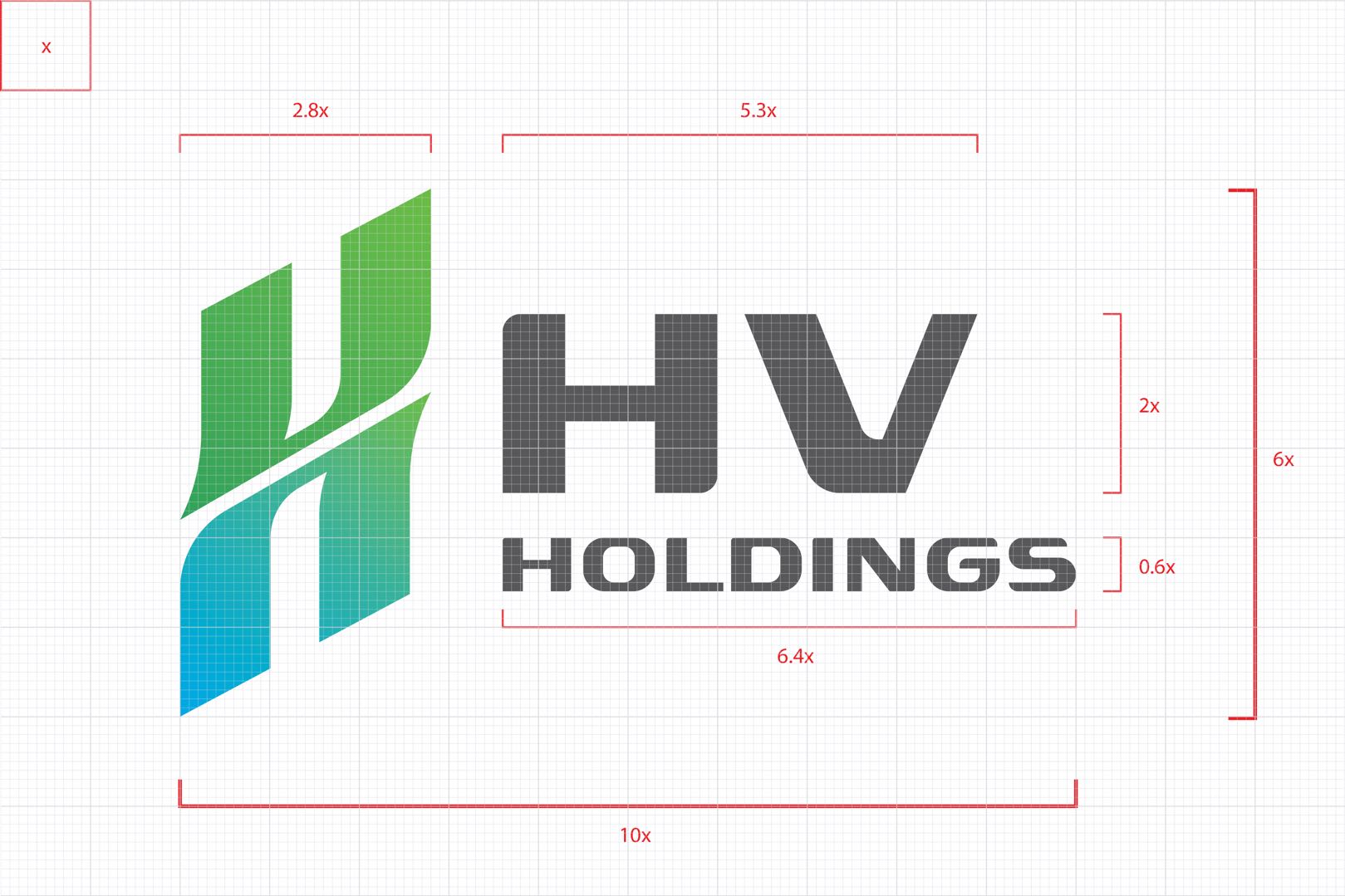Logo HV Holdings được xây dựng trên đơn vị chuẩn x, với tổng thể 10x chiều ngang và 6x chiều cao. Biểu tượng chiếm 2.8x chiều rộng, toàn bộ 6x chiều cao, tạo trụ cột vững chắc. Phần chữ gồm “HV” cao 2x, rộng 5.3x và “HOLDINGS” nhỏ hơn, cao 0.6x, rộng 6.4x, được canh thẳng hàng. Tỷ lệ này giúp logo cân đối, hiện đại, nhấn mạnh thương hiệu “HV” trong khi vẫn hài hòa với biểu tượng.