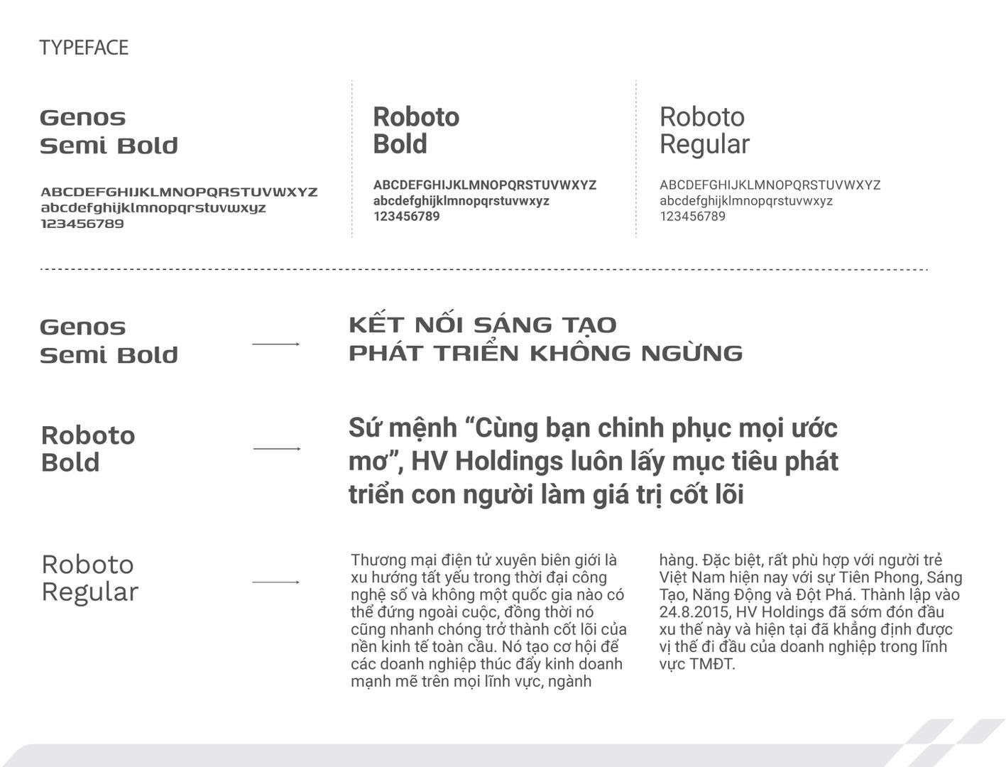 Kiểu chữ chủ đạo là Genos SemiBold và Roboto, với sự kết hợp hài hòa giữa mạnh mẽ và dễ đọc, giúp nhận diện HV Holdings đồng bộ trên mọi nền tảng truyền thông.